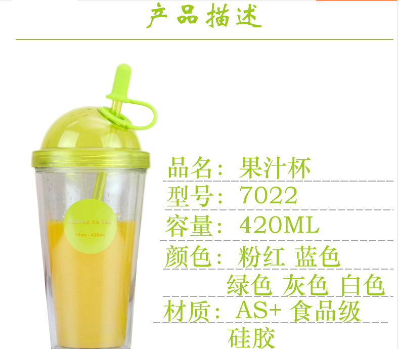 產(chǎn)品特點(diǎn):AS食品級(jí)材質(zhì),420M容量,多種顏色選擇,雙層果汁杯、牛奶杯