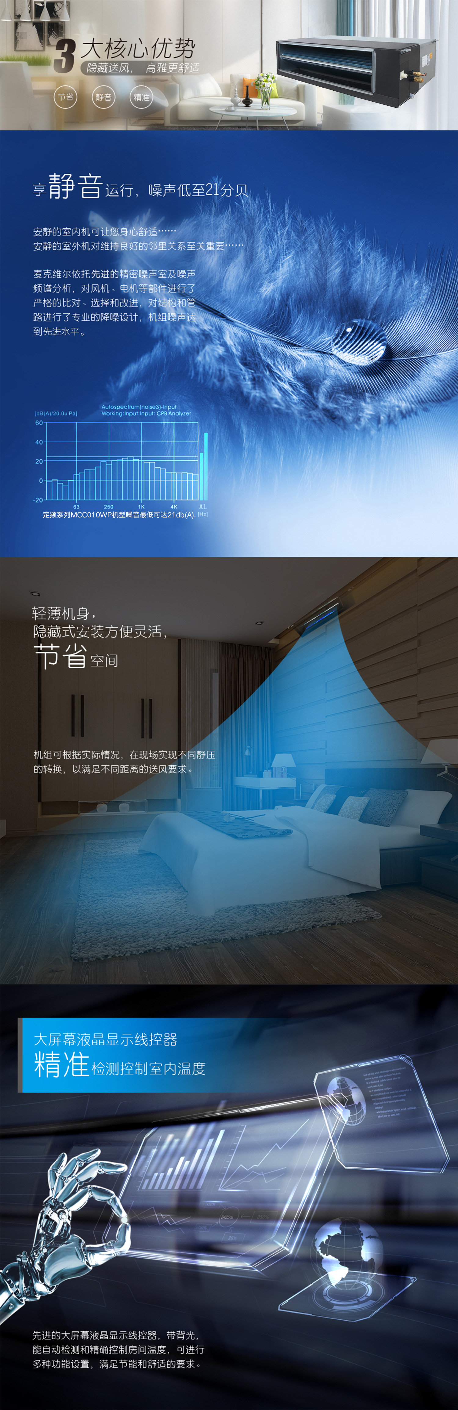 產(chǎn)品理念:采用變頻科技,讓機(jī)組時刻處于高效的工作狀態(tài)。應(yīng)用窄型結(jié)構(gòu)設(shè)計,大幅度節(jié)約安裝所用空間,可與各類裝修風(fēng)格融合。依托于精密噪音實驗室和先進(jìn)的多通道噪聲分析模擬軟件,通過結(jié)構(gòu)和控制邏輯的優(yōu)化創(chuàng)新,針對性的對室內(nèi)機(jī)噪聲源進(jìn)行遏制和隔斷,打造安靜的室內(nèi)空間。